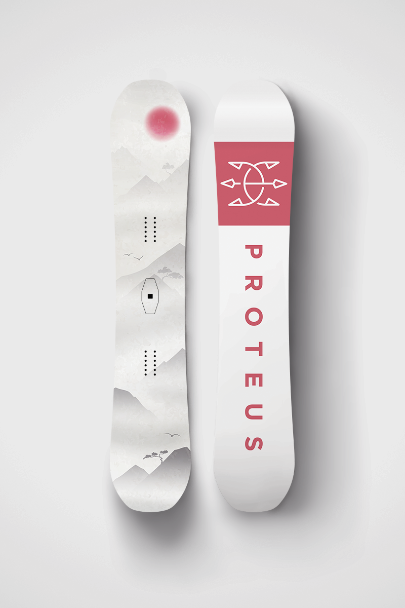 Art by Katelynne Cooper. Inspired by Asian landscape artwork and many hazy days on the mountain. As with all Proteus boards, this design features the patented Proteus Adjustable Camber system, a guaranteed-premium board construction and a strategic, multi-directional shape. Now with Thru-Stitch Technology that will keep your board riding for many seasons to come.