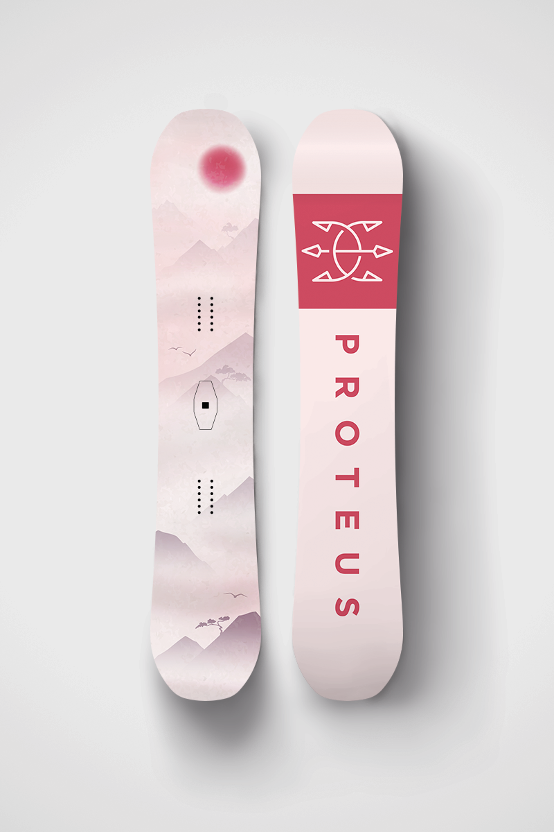 Art by Katelynne Cooper. Inspired by Asian landscape artwork and many hazy days on the mountain. As with all Proteus boards, this design features the patented Proteus Adjustable Camber system, a guaranteed-premium board construction and a strategic, multi-directional shape. Now with Thru-Stitch Technology that will keep your board riding for many seasons to come.