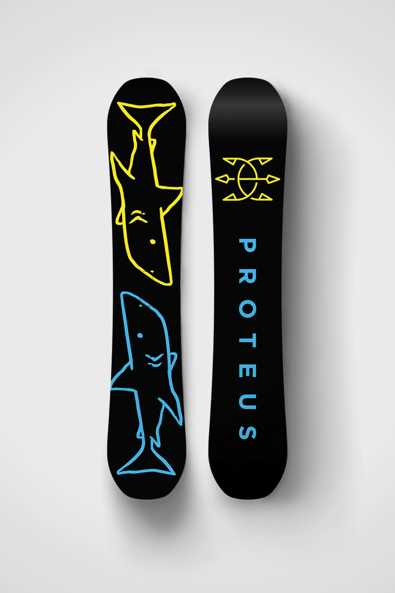 We asked Tyson “Sharknado” Allen to describe his board for us: “I’ve been told I snowboard like a shark, and I love animals, so throwing some on a design seems fitting for a board for me.” – Tyson Allen. Tyson’s signature air game and ability to hunt sick lines make him a standout competitor and an asset for Proteus R&D. Tyson is currently experimenting with boards in the 154-157 and stiffer layups to compliment his competitive riding and all-terrain range.